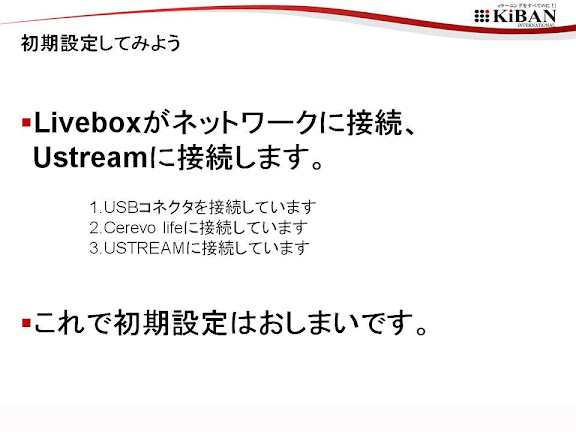 株式会社キバンインターナショナル(東京都千代田区 代表取締役社長 西村正宏 http://kiban.jp)では、USTREAM配信専用端末のCerevoLiveboxを購入したけれども、設定が上手くいかず、使いこなせないと悩んでおられるかたに、設定代行ならびに、設定代行サービスを開始します。サービスの内容は下記の通りです。